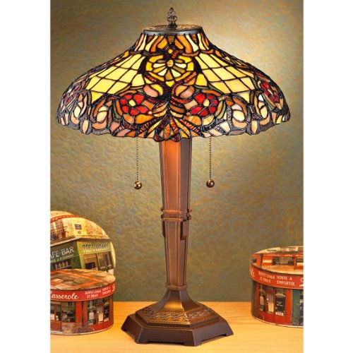 Handcrafted Tiffany - style Table Lamp adds a warm, inviting touch to a room in need. SAVE BIG! The original Louis Comfort Tiffany Lamps were described as "light concealed behind jewels." This Tiffany-style Lamp is similar. Not an original, but its shade bursts with gorgeous hues of Red, Green, Cream and Gold-tones... composed of 596 glass cuts and 12 cabochons, hand cut and foiled. It's worth every penny of the original 0.00 price tag... here, though, it's yours for a sparkling amount LESS! The gorgeously proportioned cast resin base has an antique bronze finish, and it won't scratch your favorite table thanks to its felted bottom. Shade is approx. 16" in diameter. Uses two 60W max. bulbs (not included), with on / off pull chains. Stands 23"h. Weighs 8 lbs., 8 ozs. 120V, 60Hz. 65" Cord. UL-listed. Your home deserves this beautiful addition... order yours now! Tiffany-style Table Lamp