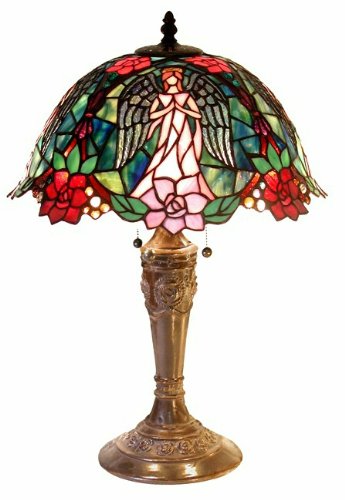 Handcrafted using methods first developed by Louis Comfort Tiffany Contains 608pieces of stained glass, each hand-cut and wrapped in fine copper foil Angel motif with 44 cabochon accents Requires two 60-watt candelabra bulb (not included) Operates with two pull chains and an in-line switch Measures 21.5 inches high x 14 inches in diameter at shadeNote: Shade colors will appear darker and less vibrant when not illuminated.